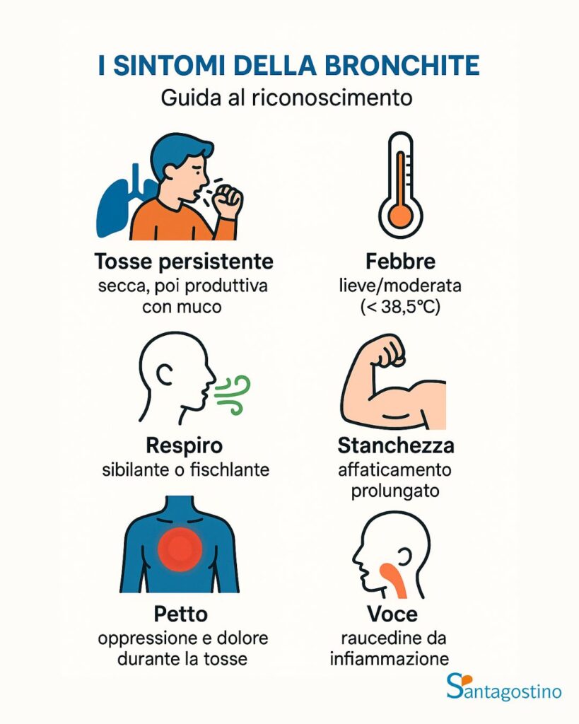Il sintomo principale della bronchite è una tosse persistente che può iniziare come secca e poi diventare produttiva, con espettorazione di muco. Il catarro può essere trasparente, bianco, giallastro o verdastro. Una tosse che produce muco colorato per più giorni è un segnale tipico di bronchite.