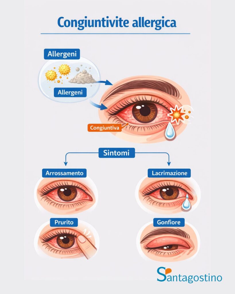 La congiuntivite allergica si verifica quando il sistema immunitario identifica erroneamente sostanze innocue come minacce, attivando una risposta infiammatoria mediata dalle immunoglobuline E (IgE) e dal rilascio di istamina dai mastociti congiuntivali.