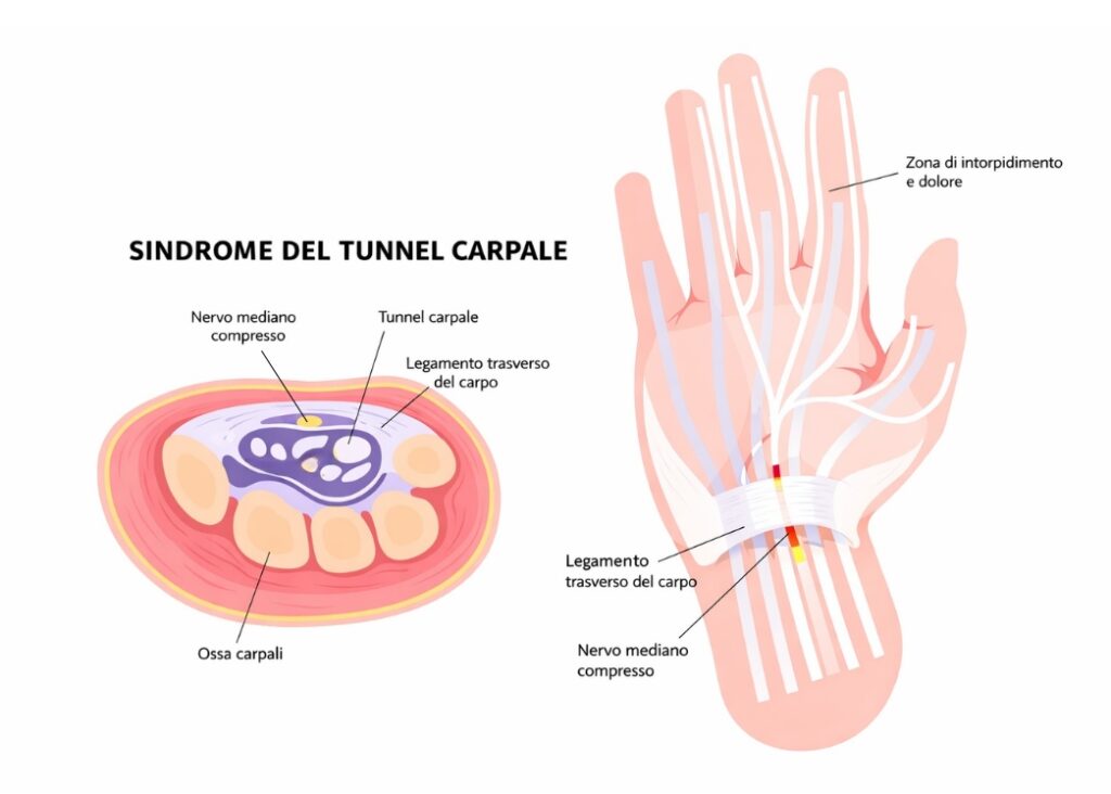 La sindrome del tunnel carpale è una neuropatia da compressione che colpisce il nervo mediano nel suo passaggio attraverso il polso. Il tunnel carpale è una struttura anatomica stretta, delimitata dalle ossa del carpo e da un legamento trasverso, all’interno della quale scorrono nove tendini flessori e il nervo mediano. Quando lo spazio disponibile si riduce, il nervo subisce una compressione che interferisce con la conduzione nervosa e il flusso sanguigno.